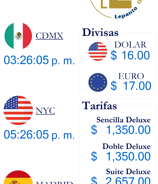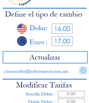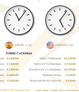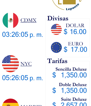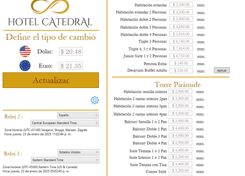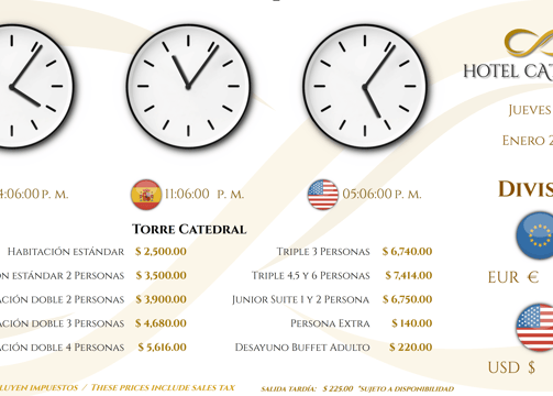 El panel de configuración permite gestionar elementos editables que se mostrarán en una segunda pantalla. A través de este panel, se pueden visualizar los relojes de manecillas que indican la hora en diferentes ciudades. El primer reloj está fijo en la Ciudad de México (CDMX), mientras que los otros dos relojes son configurables, lo que permite seleccionar otras ciudades del mundo para mostrar su hora correspondiente. Además, el panel incluye una sección dedicada a las listas de precios de habitaciones, facilitando así la gestión de la información para el usuario. Esta herramienta es ideal para hoteles que necesitan mantener a sus clientes informados sobre la hora en distintas partes del mundo, además de ofrecer datos relevantes sobre las tarifas de hospedaje.