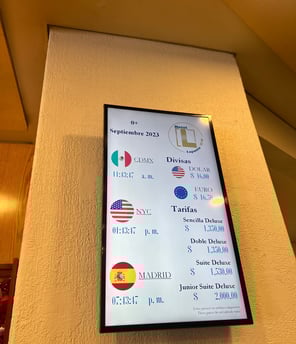 Este panel de configuración de elementos editables permite personalizar la visualización en una segunda pantalla, ideal para entornos como hoteles o espacios de trabajo. Este sistema ofrece la posibilidad de mostrar la hora actual en diferentes ciudades del mundo, facilitando la planificación y comunicación en un entorno internacional. Además, permite la información sobre los precios de las habitaciones, brindando a los usuarios una referencia clara y rápida para la toma de decisiones. También se incluye la opción de visualizar tasas de cambio de divisas, lo que resulta esencial para huéspedes y visitantes que necesiten realizar transacciones en diferentes monedas. Con esta herramienta, se mejora la experiencia del usuario al proporcionar información relevante y actualizada de manera dinámica.